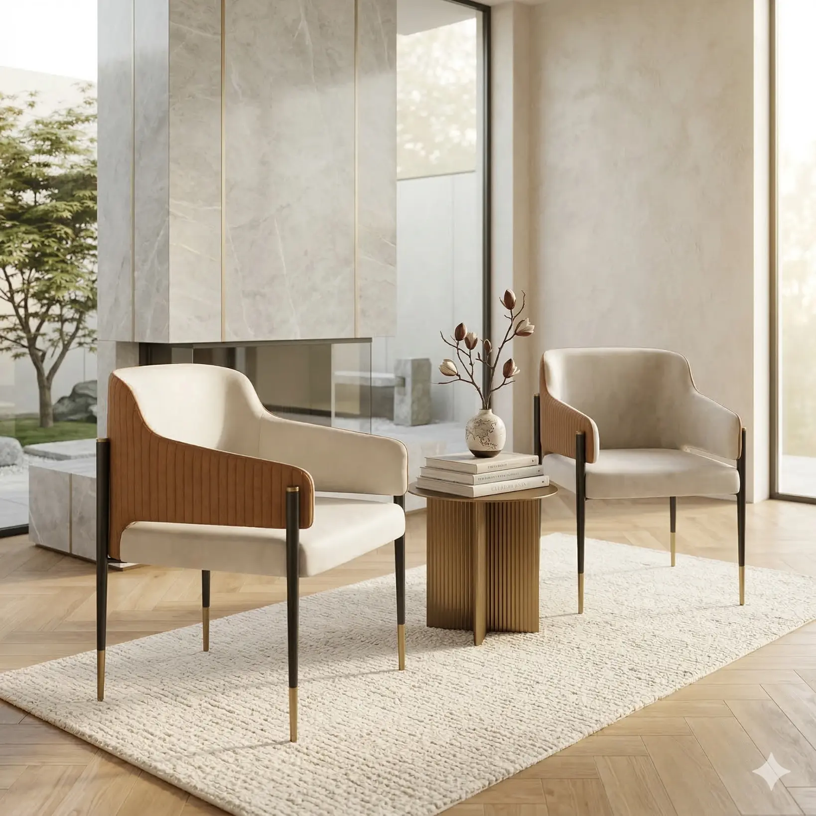 Available in a curated range of fabrics and leathers, with customization across upholstery tone, leather panel color, channel spacing, and stitch definition. Leg and tip finishes can be specified in alternative metal tones to tune warmth and contrast while preserving the chair’s balanced proportions and understated presence.