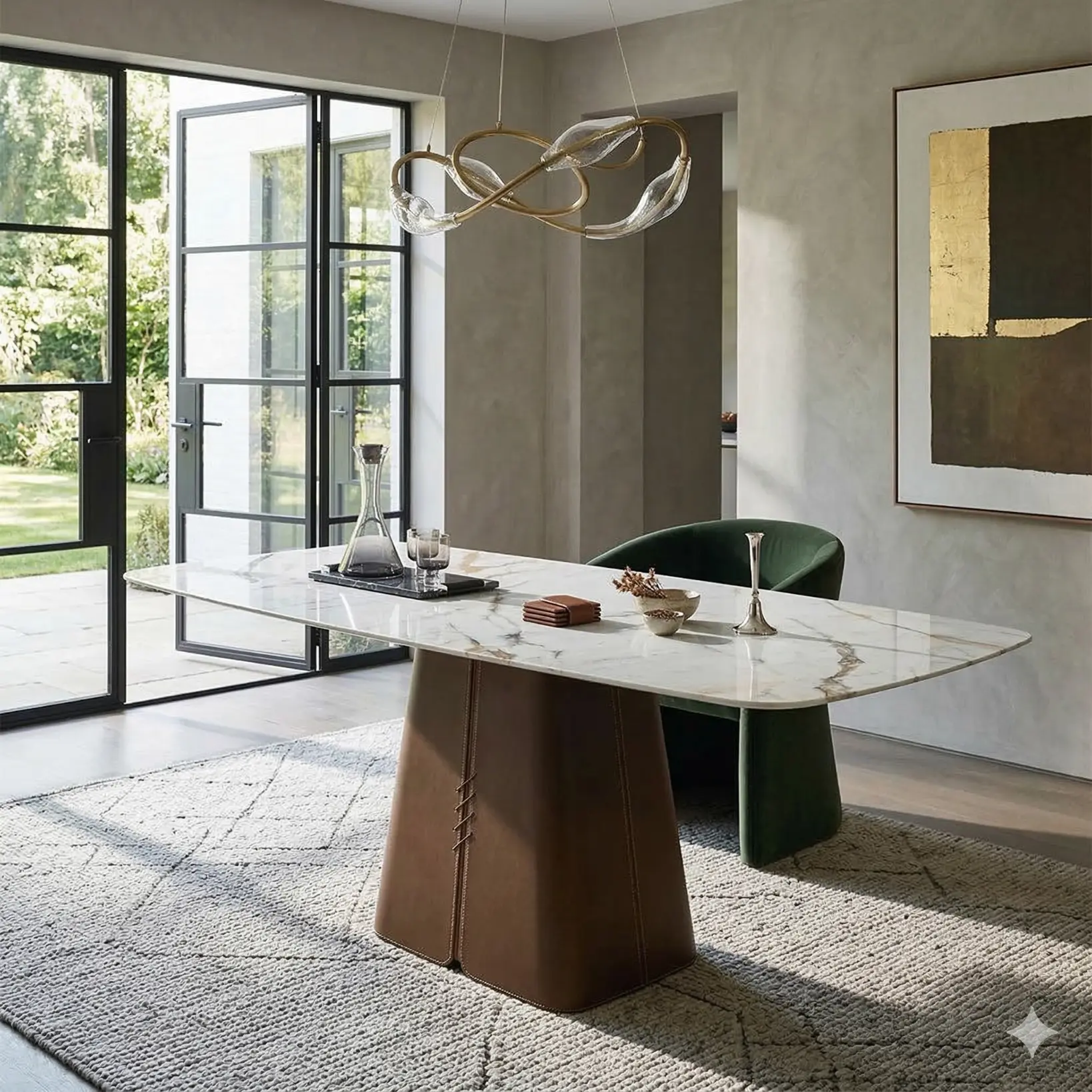This Zingaro Dining Table pairs a quiet stone plane with a tactile, architectural core. The top is broad and thin-edged—marble with restrained veining—kept soft at the corners so the silhouette reads calm rather than sharp. Beneath, a central pedestal rises as two gently flared planes, joined by a precise seam that becomes the table’s only graphic note. The stitching detail is discreet and disciplined, adding depth and material contrast against the cool stone above. The composition feels balanced: weight held at the center, openness preserved at the perimeter, and an overall presence defined by proportion and clarity.